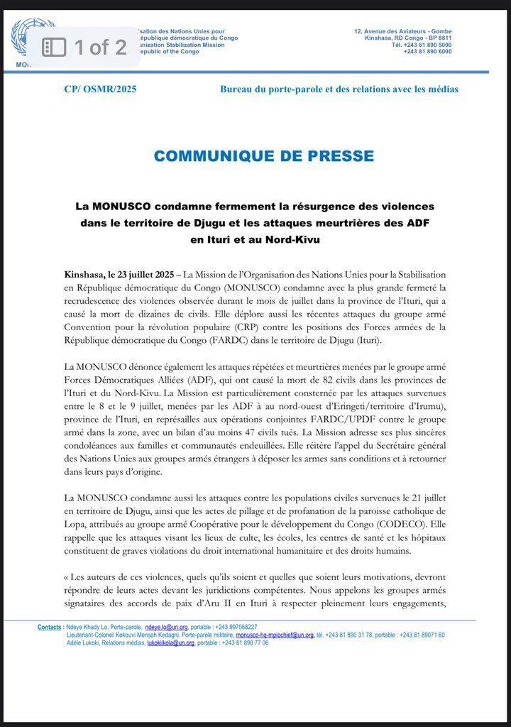 La MONUSCO condamne fermement la résurgence des violences dans le territoire de Djugu et les attaques meurtrières des ADF en Ituri et au Nord-Kivu.