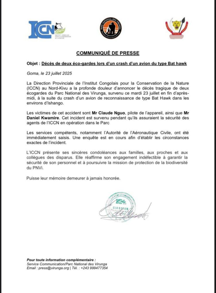 Deux éco-gardes ont trouvé la mort le mardi 23 juillet 2025 dans un crash d’avion de reconnaissance de type Bat Hawk dans les environs d’Ishango, en plein parc national des Virunga, au Nord-Kivu, dans l’est de la République démocratique du Congo, a annoncé le mercredi, l’Institut national pour la conservation de la nature (ICCN), dans un communiqué.