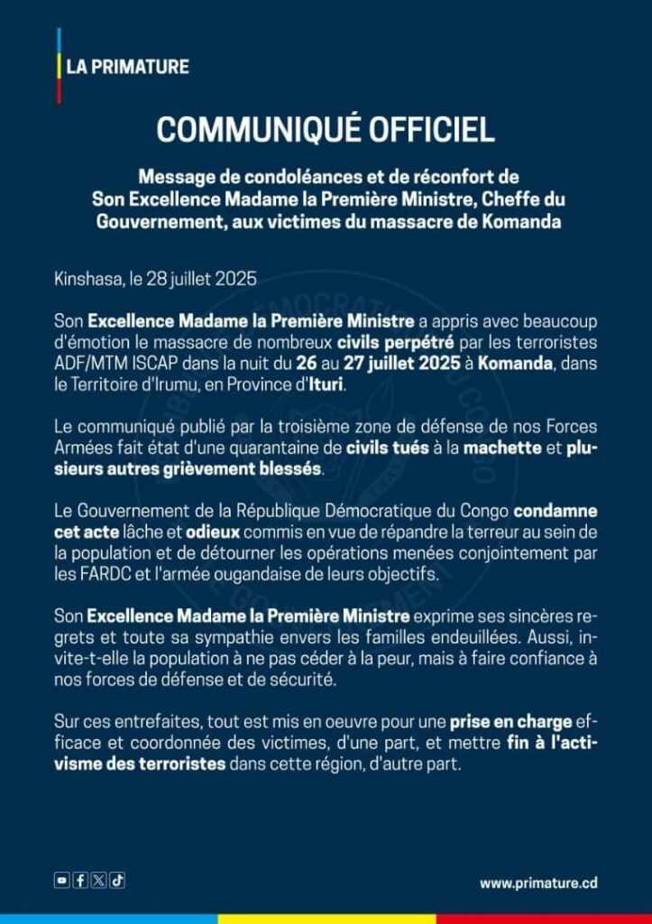C’est dans un communiqué rendu public ce lundi 28 juillet 2025 que la première ministre Judith informe qu’elle a appris avec beaucoup d’émotion le massacre de nombreux civils perpétré par les terroristes de ADF/MTM ISCAP dans la nuit du 26 au 27 juillet 2025 à Komanda, dans le Territoire d’Uruguay, en Province d’Ituri.