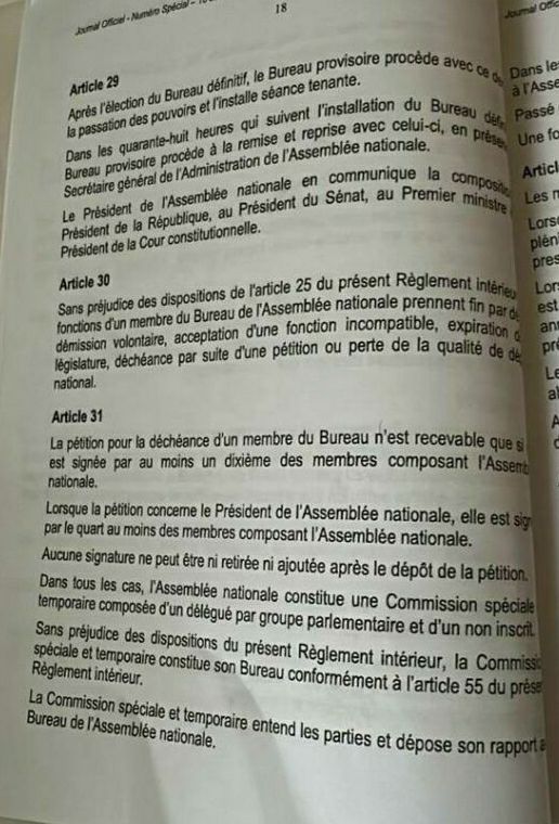 Et n’étant pas muet sur une quelconque pétition, le Règlement Intérieur de l’assemblée nationale prévoit à son article 32, 33 et 34 ce qui suit au sujet des pétitions contre les membres du bureau.