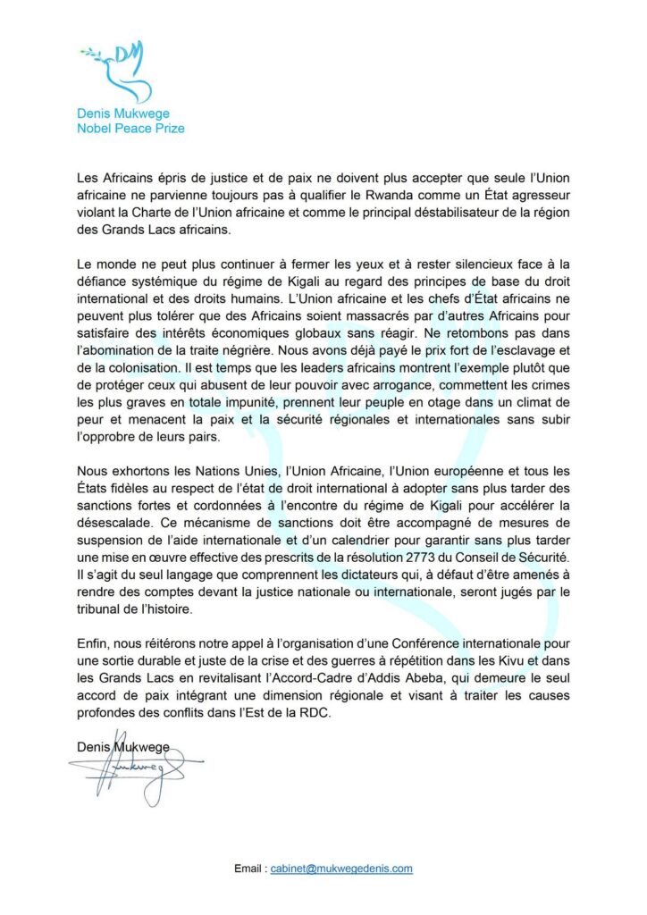 Pour Denis MUKWEGE, Le monde ne peut plus continuer à fermer les yeux et à rester silencieux face à la défiance systémique du régime de Kigali au regard des principes de base du droit international et des droits humains. L’Union africaine et les chefs d’État africains ne peuvent plus tolérer que des Africains soient massacrés par d’autres Africains pour satisfaire des intérêts économiques globaux sans réagir. Ne retombons pas dans l’abomination de la traite négrière. Nous avons déjà payé le prix fort de l’esclavage et de la colonisation. Il est temps que les leaders africains montrent l’exemple plutôt que de protéger ceux qui abusent de leur pouvoir avec arrogance, commettent les crimes les plus graves en totale impunité, prennent leur peuple en otage dans un climat de peur et menacent la paix et la sécurité régionales et internationales sans subir l’opprobre de leurs pairs.