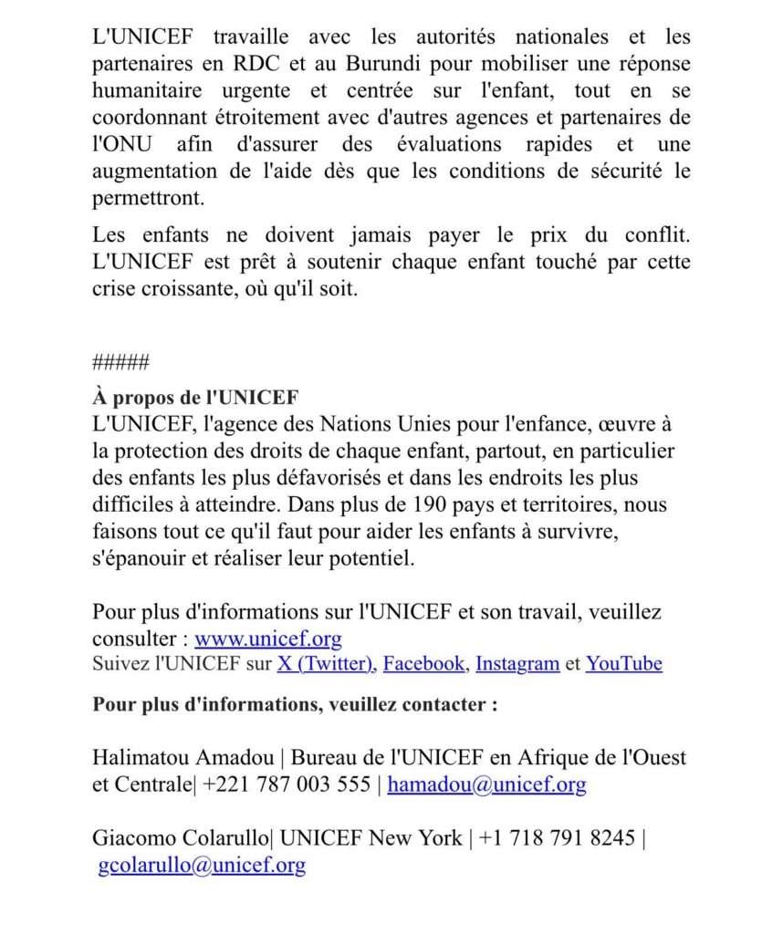 » L’UNICEF est profondément alarmé par l’escalade rapide des hostilités au Sud-Kivu, dans l’Est de la République Démocratique du Congo, qui contraint des centaines de milliers d’enfants et de familles à fuir pour se mettre à l’abri, tant à l’intérieur de la RDC qu’à travers les frontières vers le Burundi et le Rwanda. » A-t-on lu cela dans le communiqué