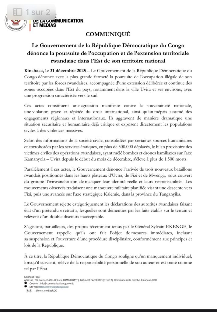 Kinshasa 31 décembre 2025 – Le gouvernement de la République démocratique du Congo (RDC) a vivement dénoncé, dans un communiqué officiel, la poursuite de l’occupation illégale de son territoire par les forces rwandaises, accusées d’étendre progressivement leur emprise dans l’Est du pays, notamment dans la région d’Uvira et ses environs.