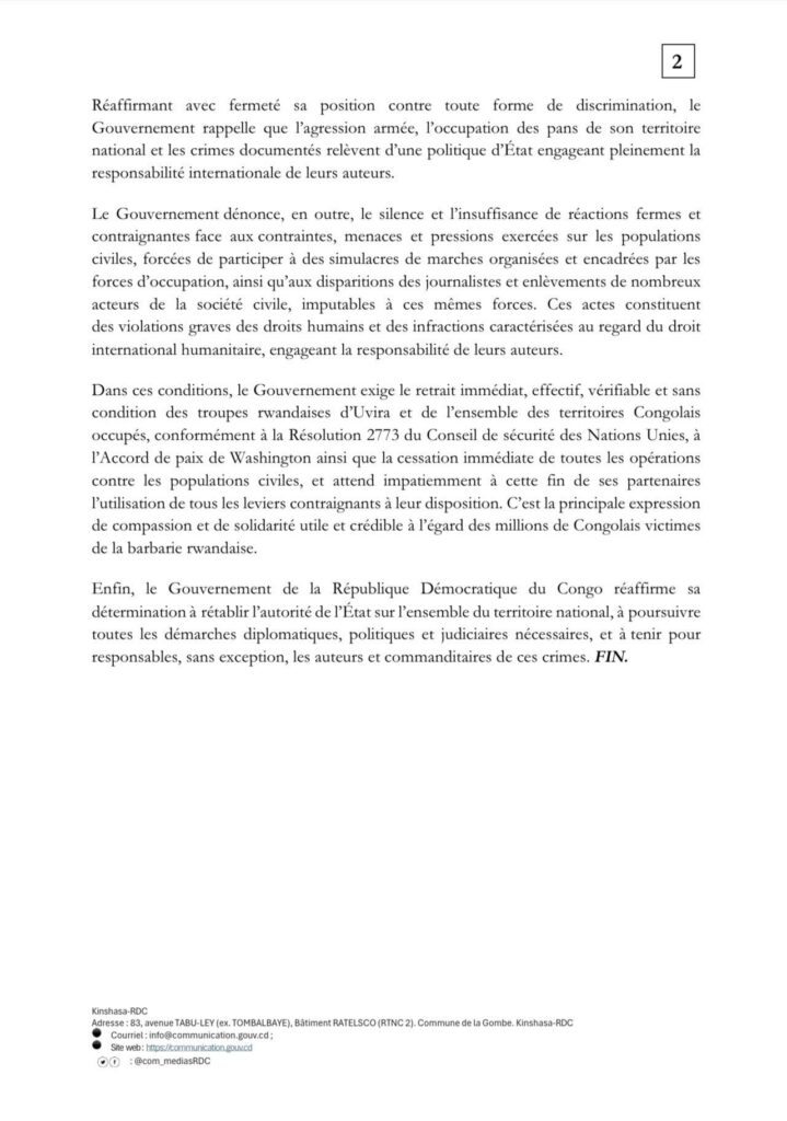 Tout en réaffirmant sa position ferme contre toute forme de discrimination, Kinshasa rappelle que l’agression armée, l’occupation de portions du territoire national et les crimes documentés engagent pleinement la responsabilité internationale de leurs auteurs.