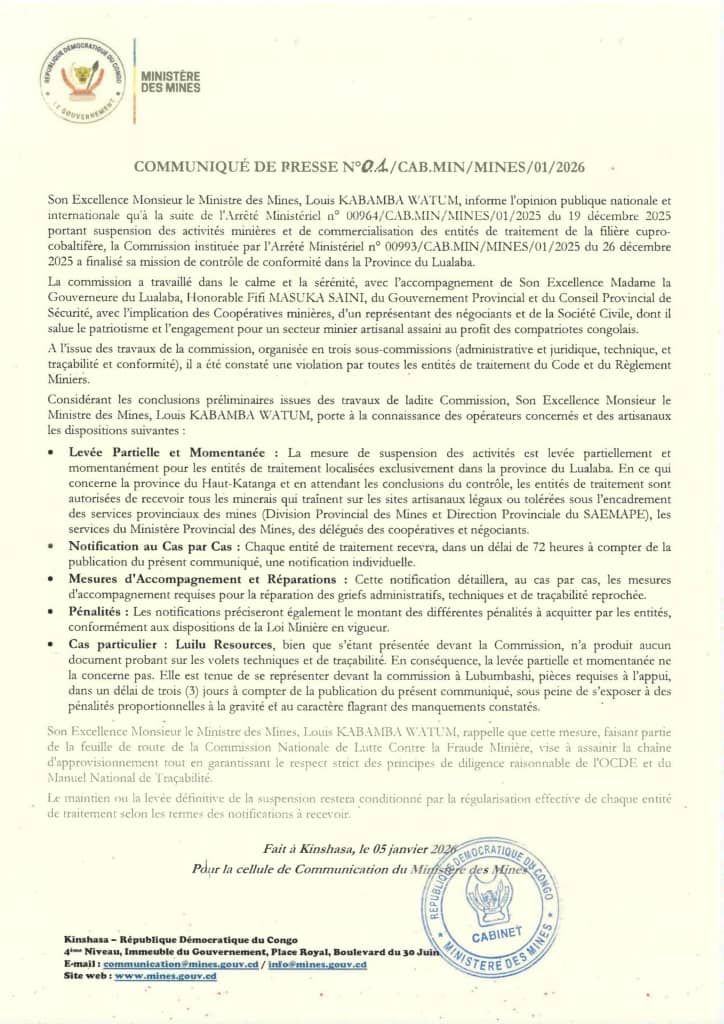 Dans un communiqué publié ce 5 janvier 2026, le ministre des Mines, Louis Kabamba Watum, annonce une levée partielle et temporaire de la mesure de suspension, limitée aux entités opérant exclusivement au Lualaba. Cette décision intervient après la mission de contrôle menée par une commission ministérielle déployée sur le terrain fin décembre 2025.