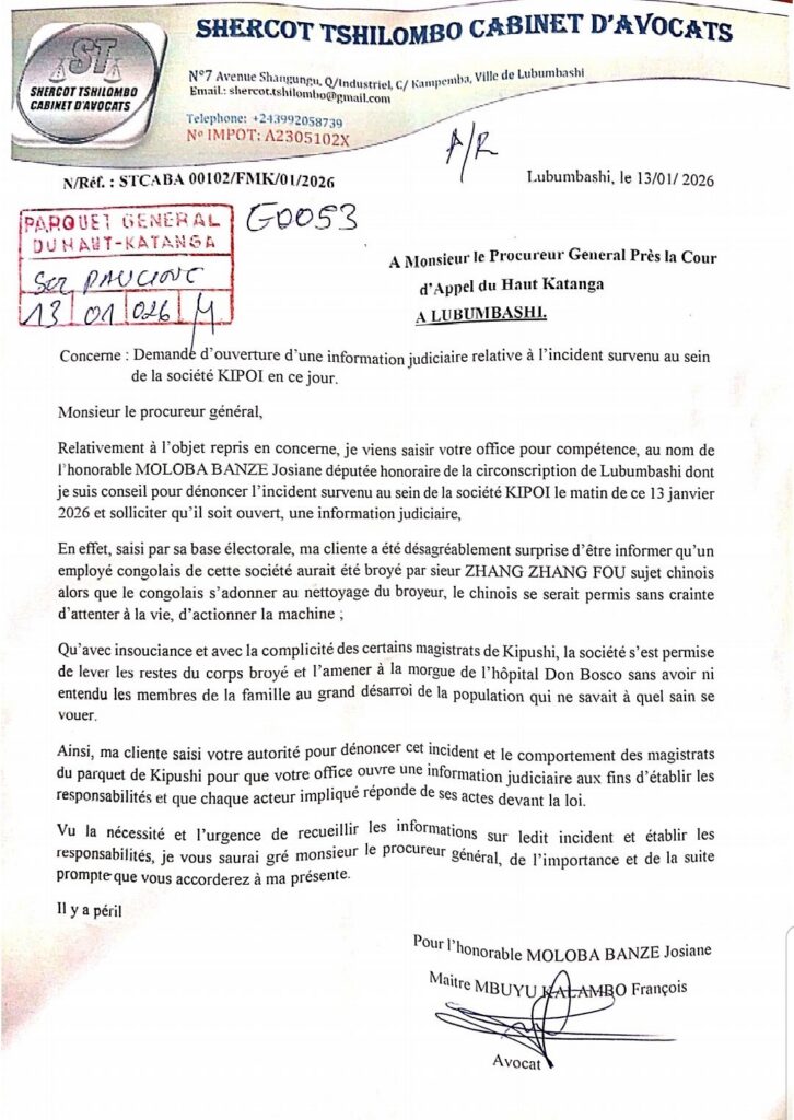 Un drame d’une extrême gravité secoue la ville de Lubumbashi. La députée honoraire de la circonscription de Lubumbashi, Josiane Moloba Banze, a officiellement saisi le Procureur général près la Cour d’appel du Haut-Katanga afin de demander l’ouverture d’une information judiciaire sur un incident mortel survenu le mardi 13 janvier 2026, au sein de la société KIPOI.