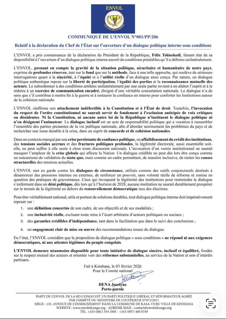 Kinshasa, 3 février 2026 — Le parti politique ENVOL a exprimé de profondes réserves quant à l’annonce du Président de la République, Félix-Antoine Tshisekedi, portant sur l’ouverture d’un dialogue politique interne assorti de conditions préalables définies de manière unilatérale par le chef de l’État.