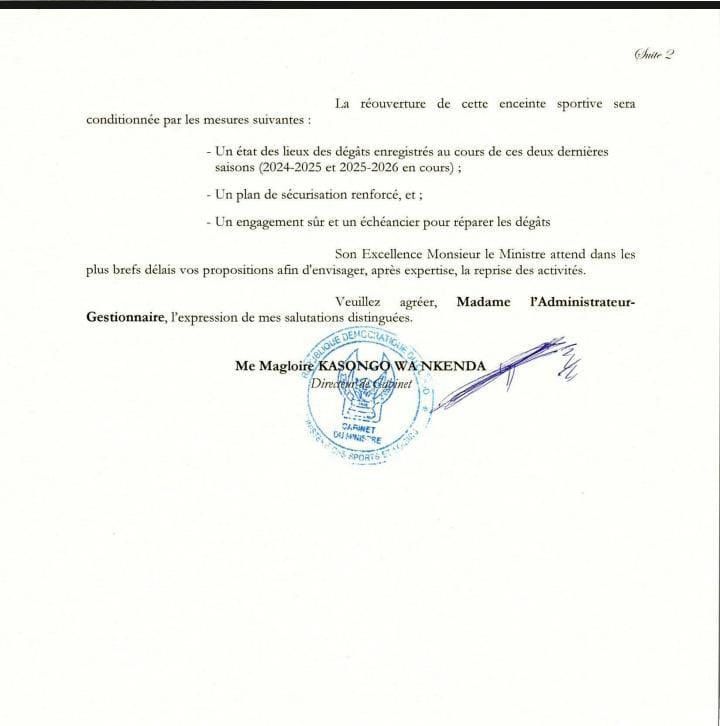 Sur instruction du ministre des Sports et Loisirs, l’Autorité administrative a notifié à l’administrateur-gestionnaire du complexe omnisport Tata Raphaël la suspension immédiate des matchs officiels dans les installations du stade, et ce jusqu’à nouvel ordre.