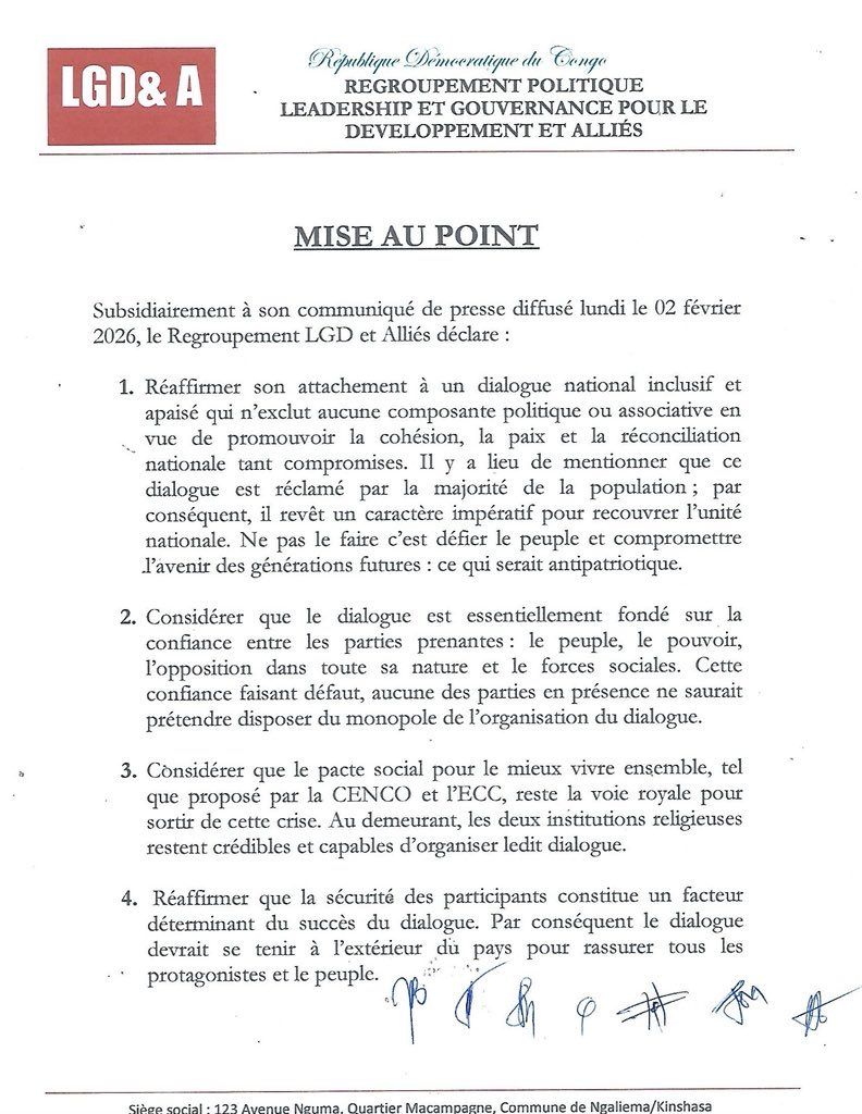 Par cette prise de position, le regroupement LGD et Alliés entend contribuer au débat national et appelle à une approche consensuelle pour répondre aux défis politiques et sociaux auxquels la République démocratique du Congo est confrontée.