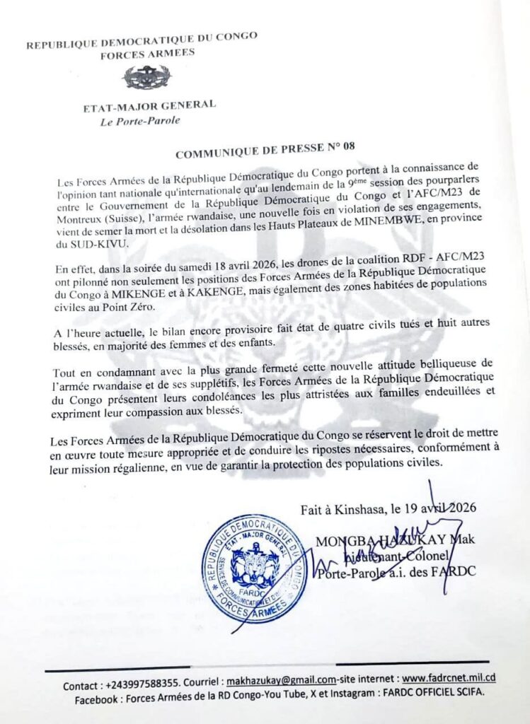 D’après ce document, ces attaques sont intervenues dans la soirée du samedi 18 avril 2026, au lendemain de la neuvième session des pourparlers entre le gouvernement congolais et les rebelles, tenue à Montreux, en Suisse. Les FARDC estiment que ces actions constituent une violation des engagements pris dans le cadre de ces discussions.