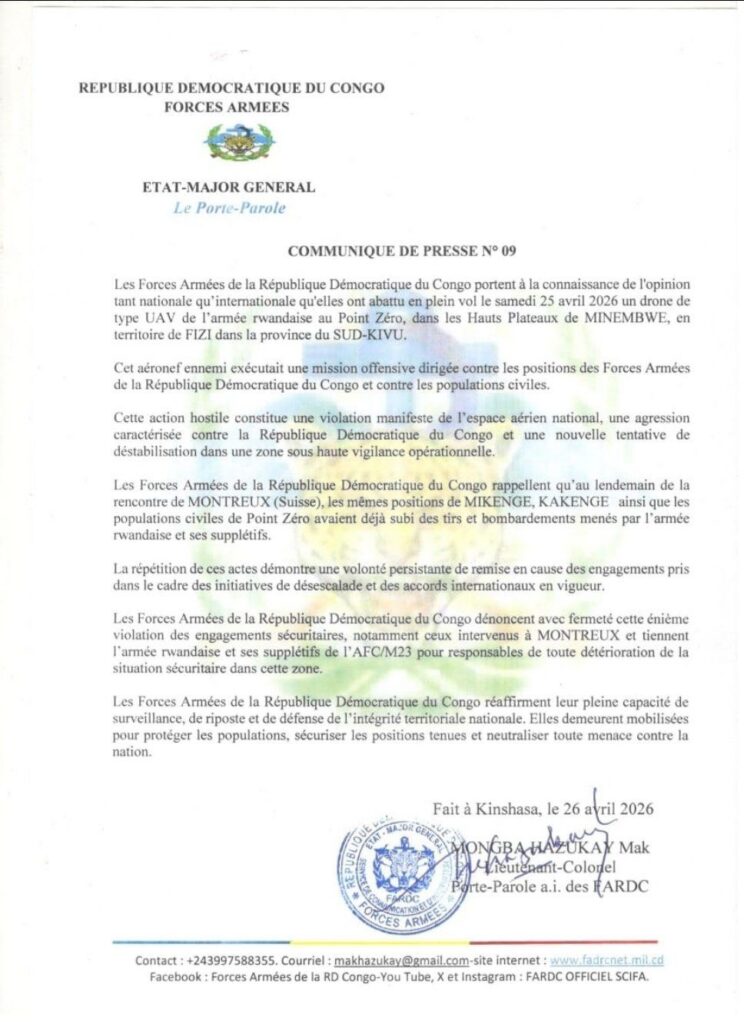 Les Forces armées de la République démocratique du Congo ont annoncé, dans un communiqué officiel publié le 26 avril 2026, avoir abattu un drone militaire attribué à l’armée rwandaise dans l’est de la République démocratique du Congo.